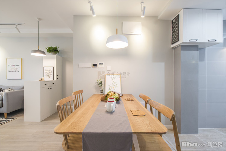 餐桌采用原木色材质与客厅电视柜端景柜颜色统一,搭配暖色调的吊灯。