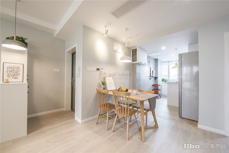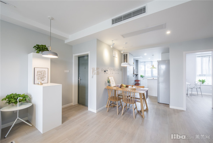 进门玄关区采用高低落差的鞋柜作为玄关,配上经典北欧吊灯使进门区域宽敞明亮。