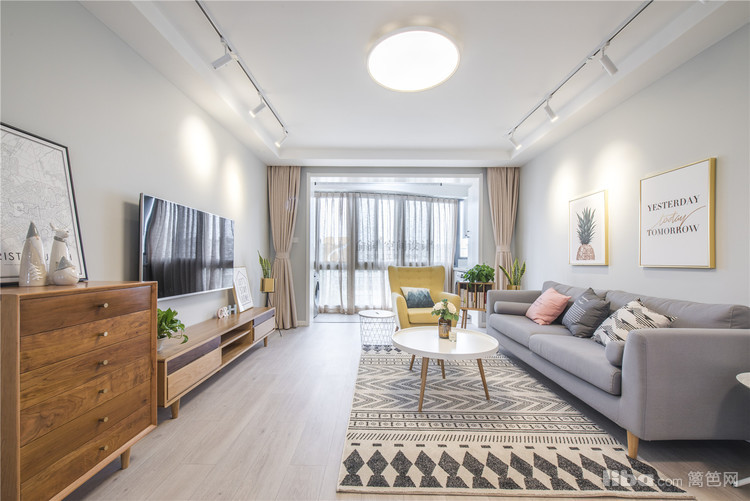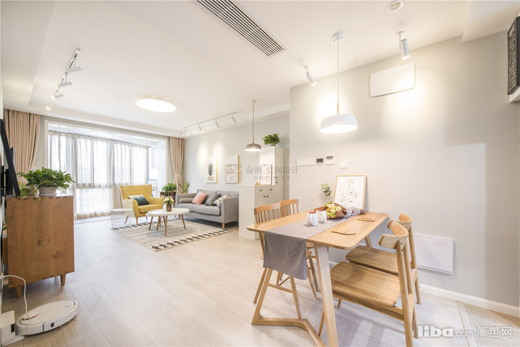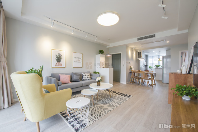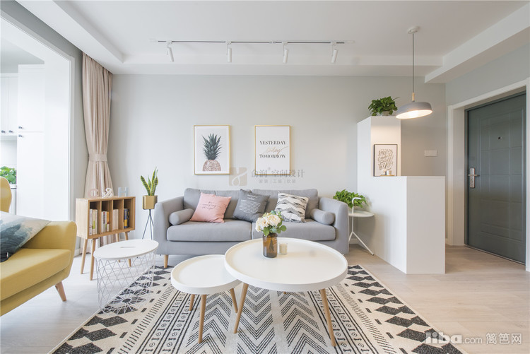 01_客厅 客厅——客厅区域整体的硬装设计主要是以浅灰色为主色调,家具主要以原木的白色为主,中央空调不仅不占空间而且美观,黄色的单人沙发作为点缀,带给人视觉上的不同感受。
