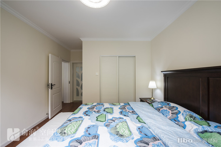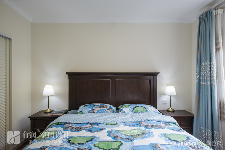 主卧,浅蓝色的窗帘,美式寝具,简洁大气,配以步入式衣帽间,很沉稳哦。