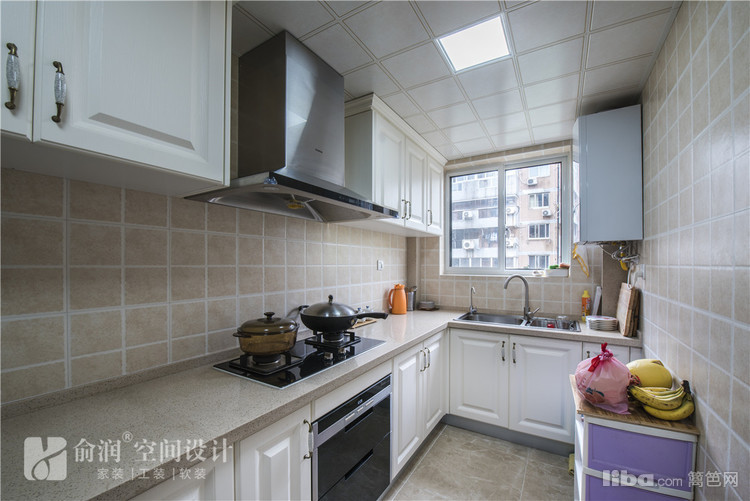 05_厨房 厨房空间:米色系的墙砖配以白色门板的橱柜。