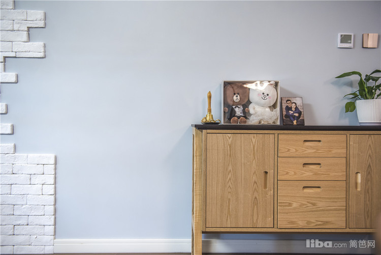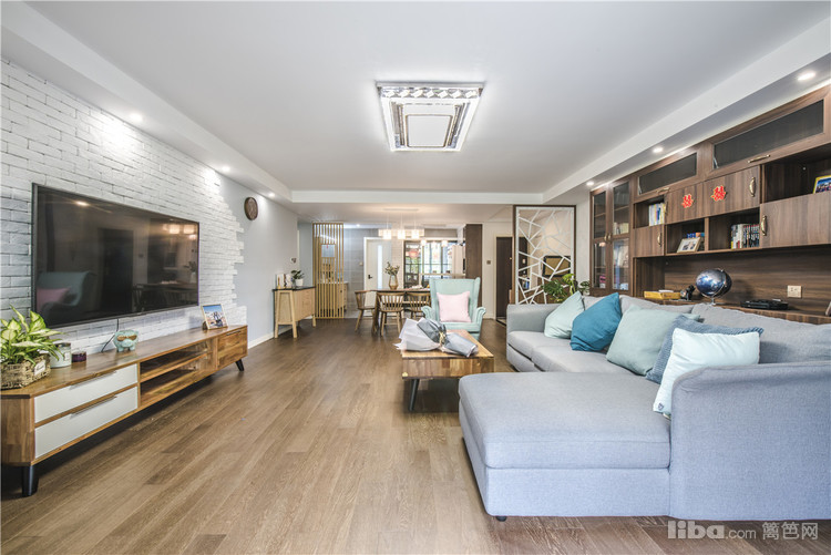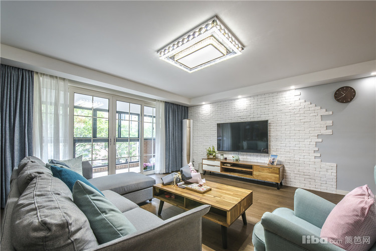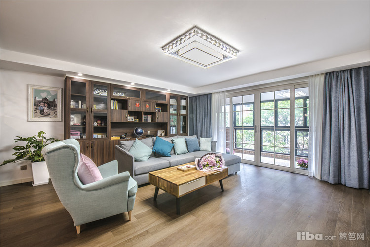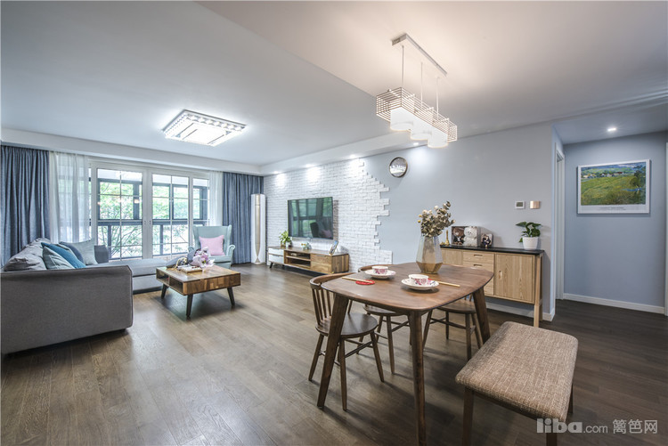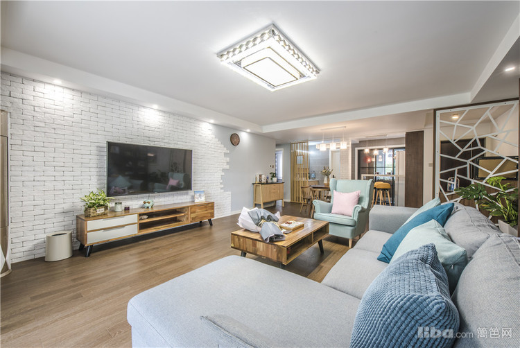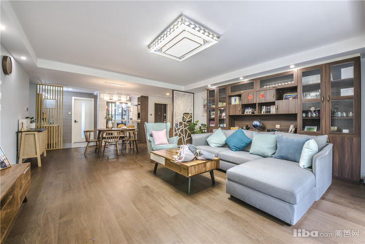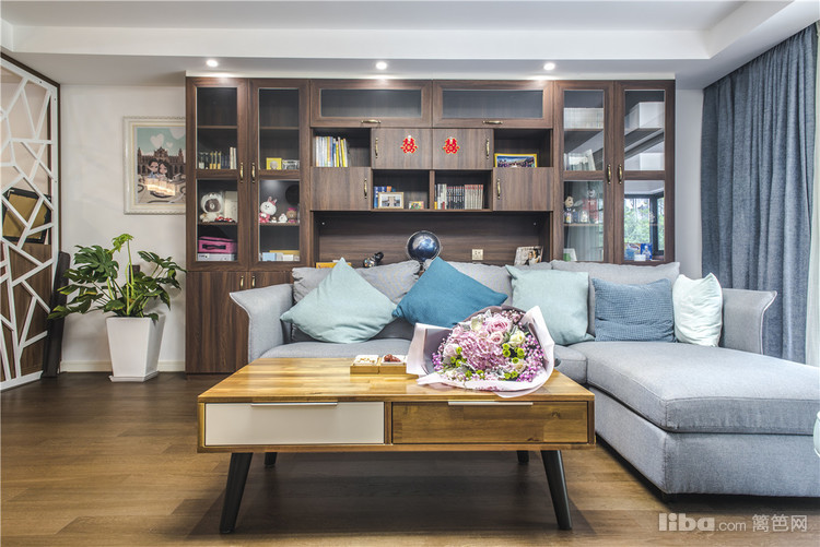 客厅:整体的硬装设计主要是以白色和雾蓝为主,家具大多采用原木和胡桃木,蓝色布艺沙发让整个空间生机勃勃,木制的家具+布艺的沙发空间的品质就这样体现的恰到好处。