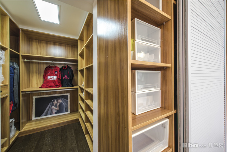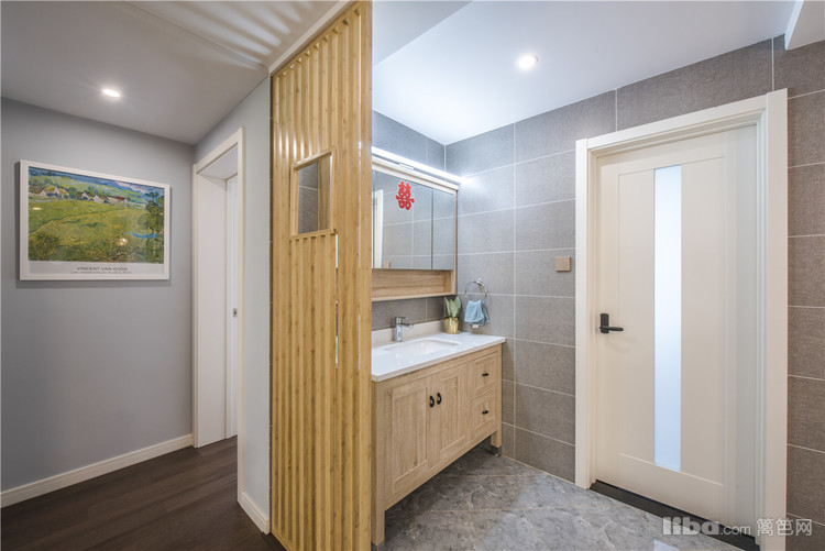 卫生间:干湿分离,采用镂空原木的隔断,不影响采光,次卫设计的外置式洗手台,原木与黑色的搭配,在经典中又来一次经典。