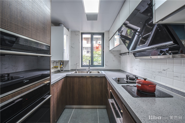 厨房:风格延续餐厅的黑胡桃质感,辅以白色的墙面砖和浅灰色台面,给主人增添料理的清爽心情,同时又不失高贵的格调。