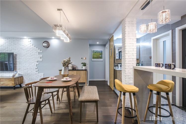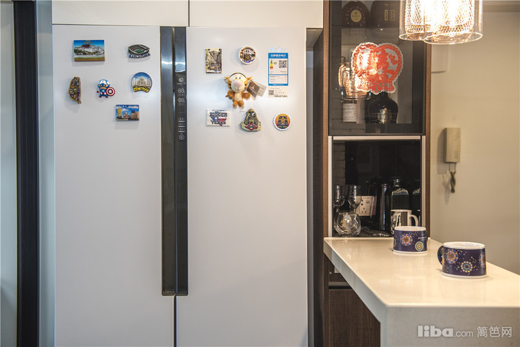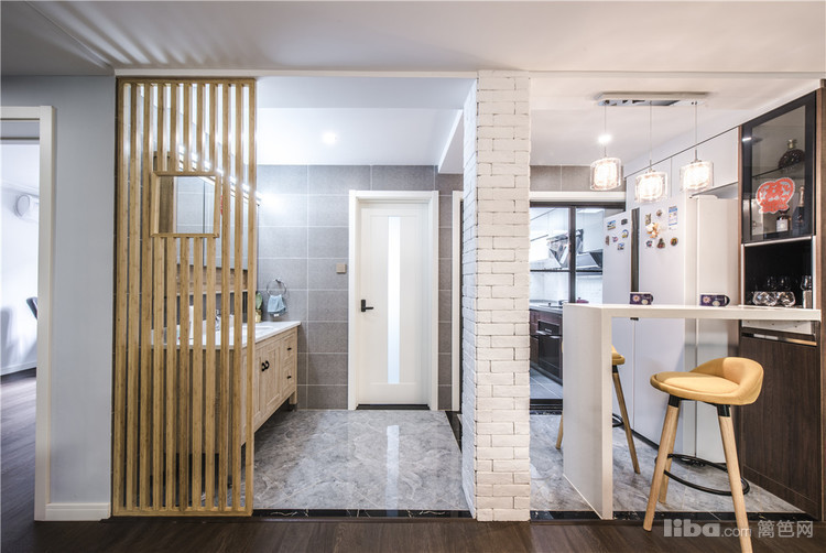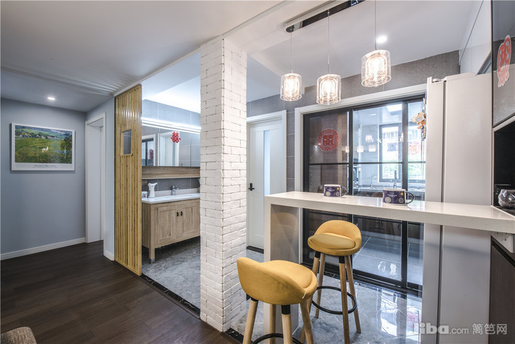应男主的需求在厨房外加一个吧台,采用爵士白的大理石台面,让整个画面精致了不少。