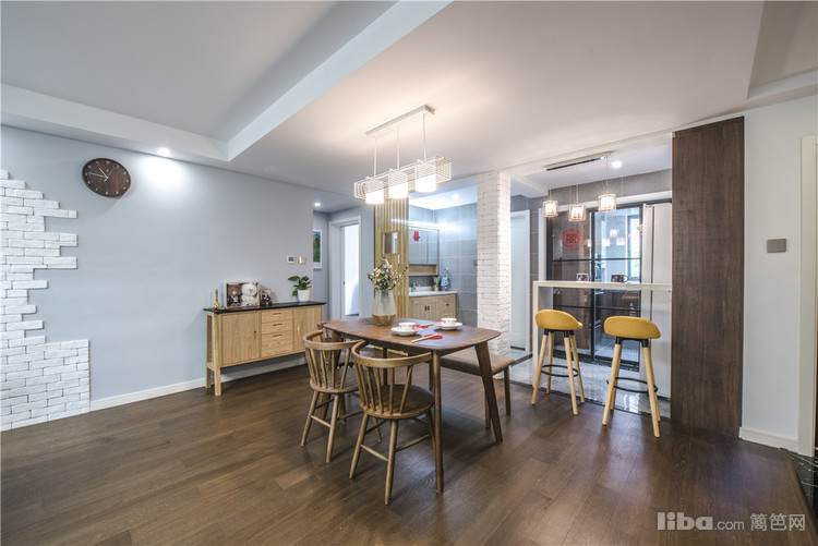 餐厅:将原有厨房与餐厅之间的墙敲掉之后是整个客餐厅通透,餐厅黑胡桃木的实木餐桌与吧台柜相呼应。