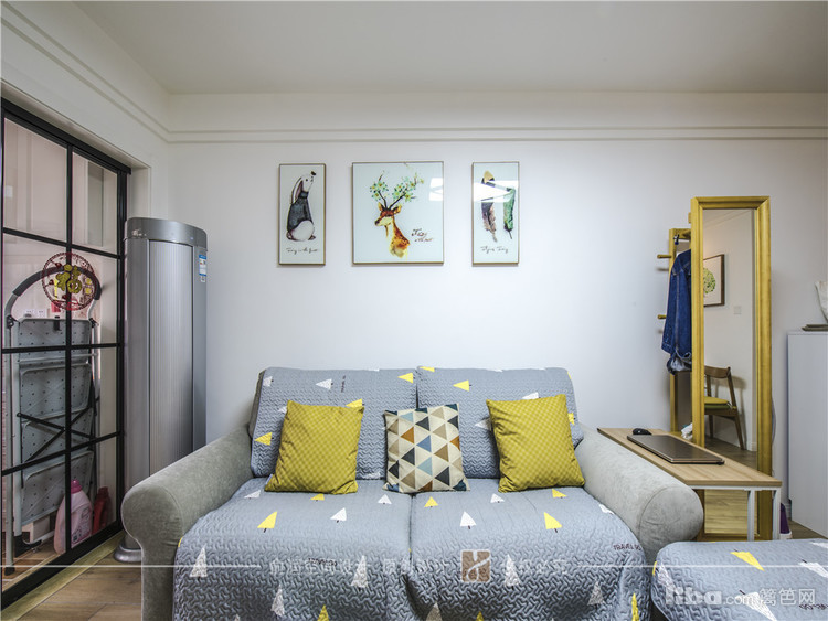 01_客厅 客厅整体以白色为基调,搭配灰色沙发与茶几、局部的木元素,并以柠檬黄的抱枕贯通整体空间,有趣的空间色彩让整体空间更加跳跃灵动,更富有层次感,放置的落地镜也让生活更有味道。