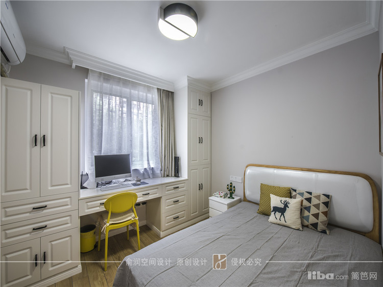 为了充分利用空间,次卧设计了靠墙式衣柜与书桌柜,既具备大量的储物空间,又让进门空间更开阔。