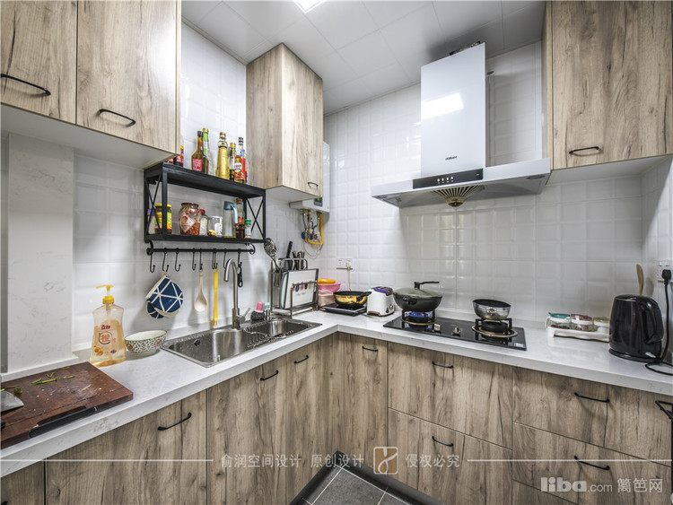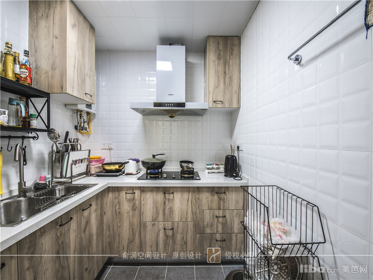 04_厨房 L型厨房,墙面采用当下流行的小白砖来搭配木纹色的橱柜。