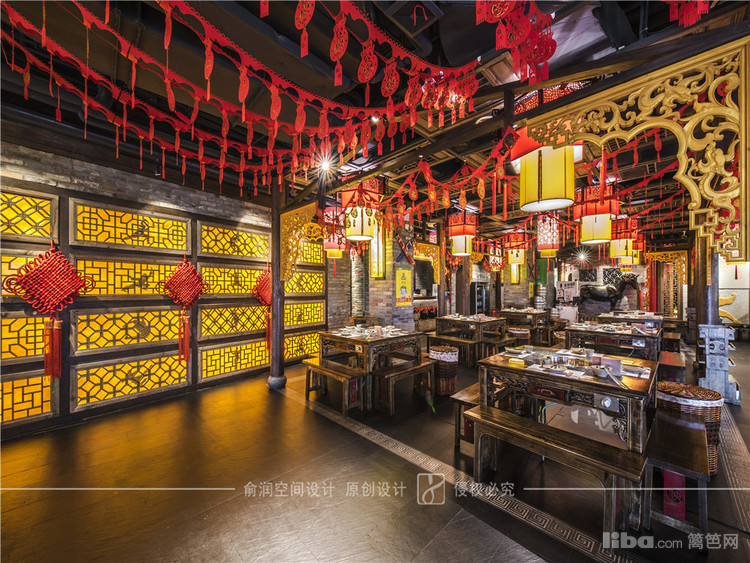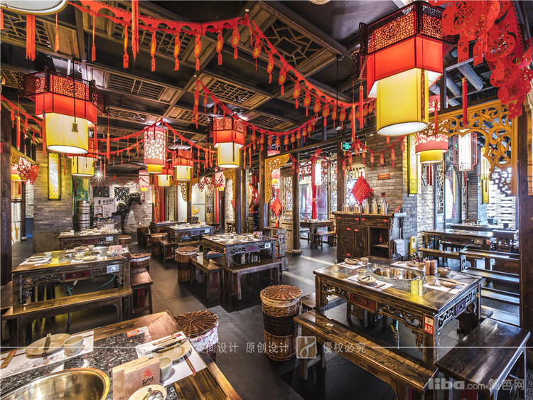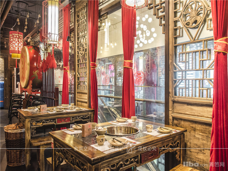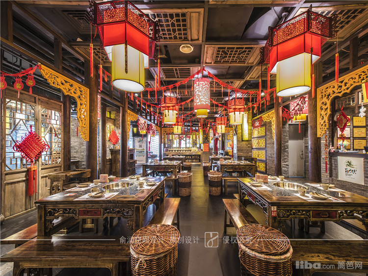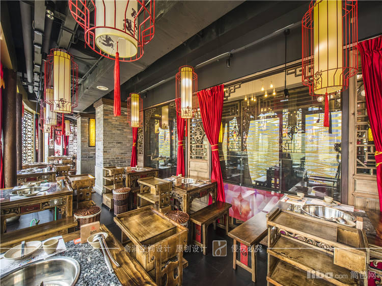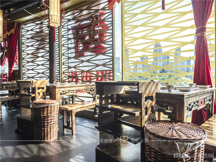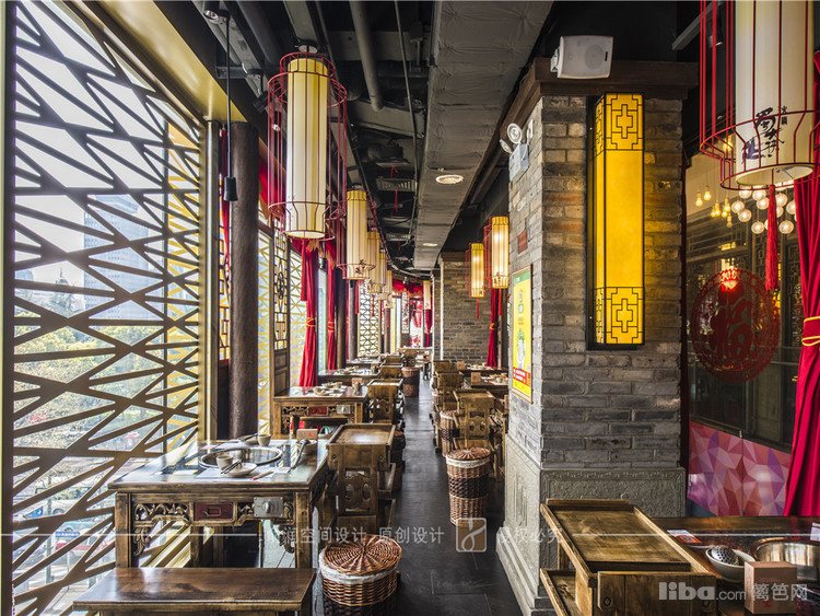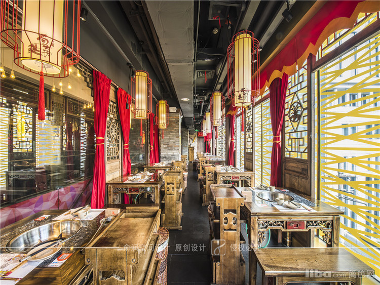 在火锅店大厅中,顶部用大红灯笼装饰,明黄色的花格窗,让顾客充分感受的火锅给味蕾所带来酣畅淋漓的感受。