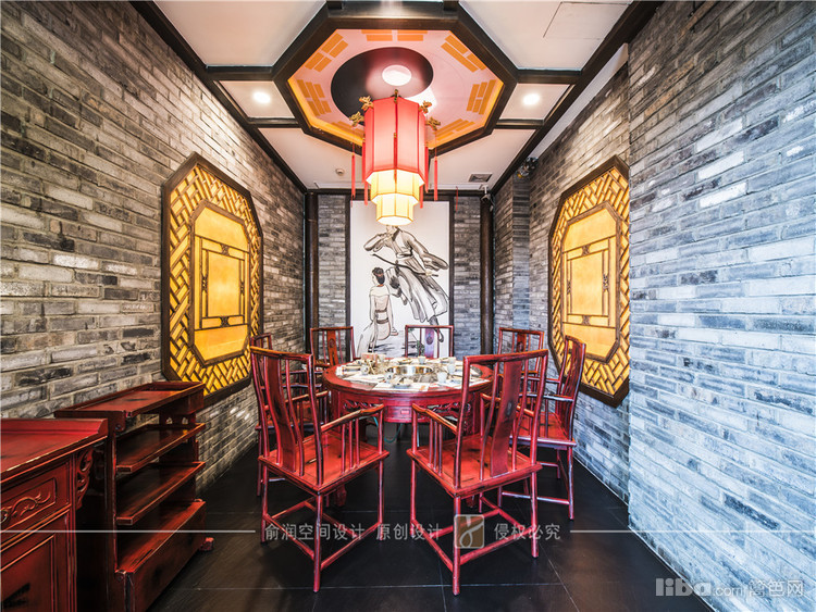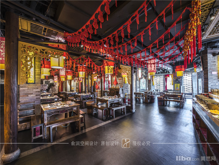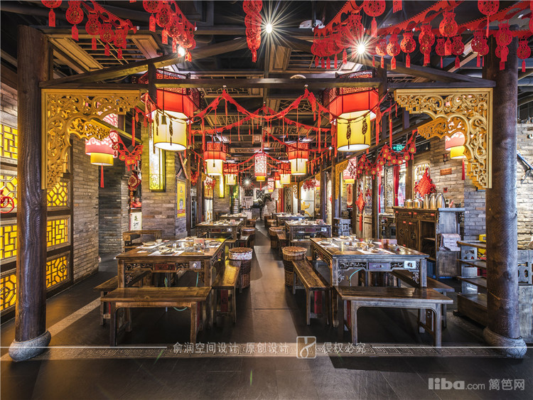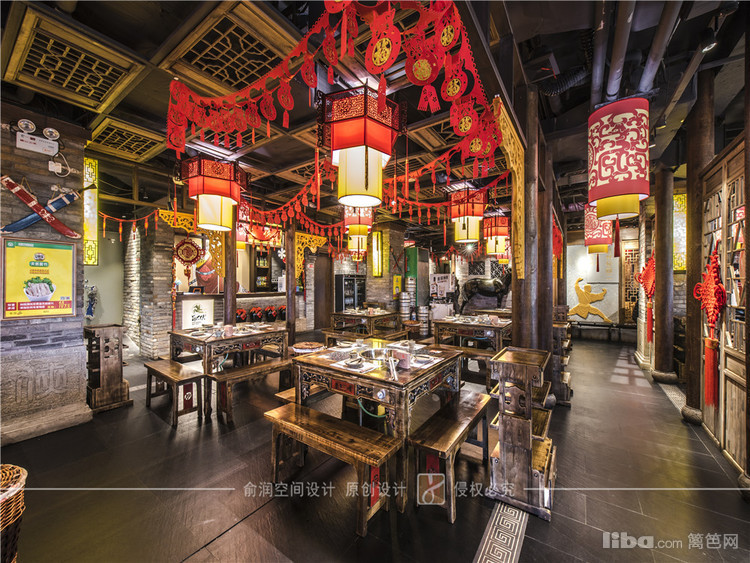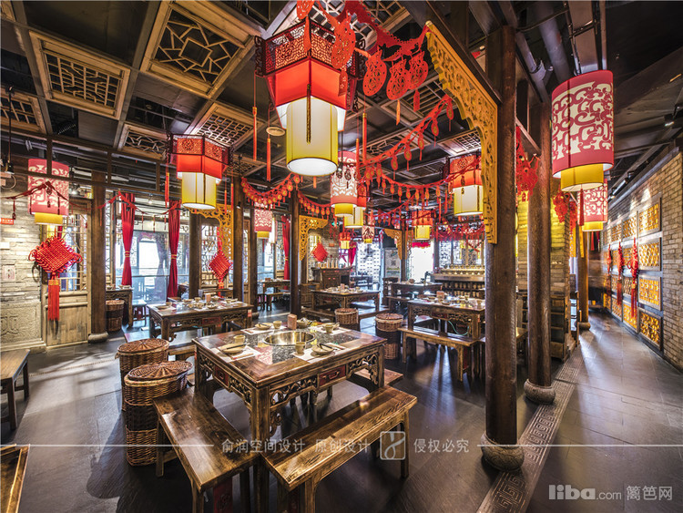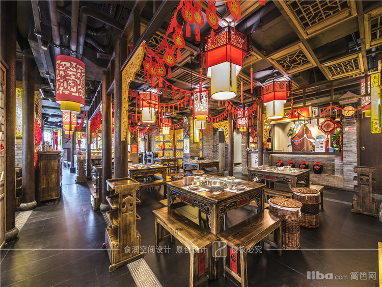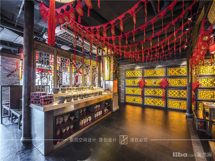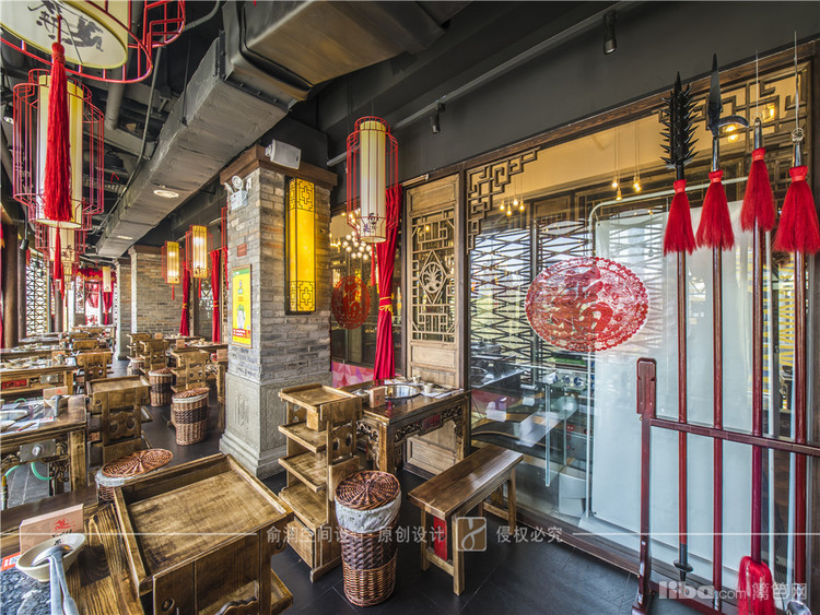 在火锅店大厅中,顶部用大红灯笼装饰,明黄色的花格窗,让顾客充分感受的火锅给味蕾所带来酣畅淋漓的感受。
