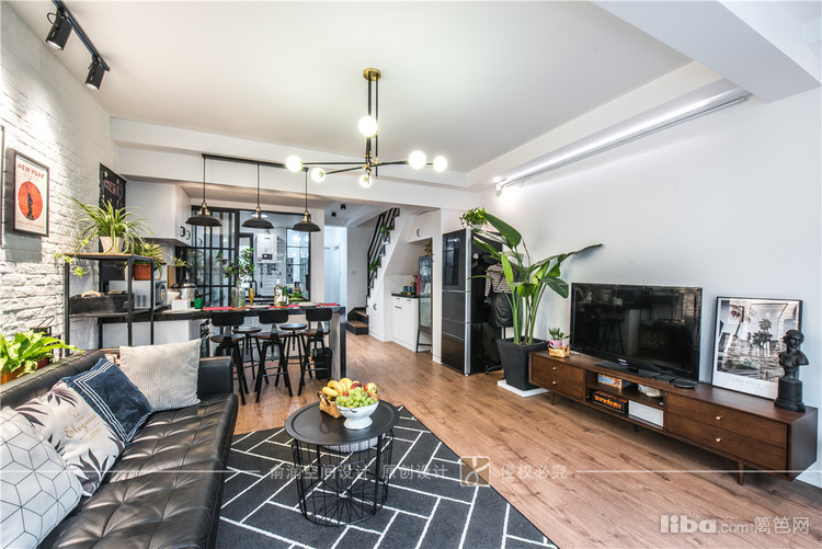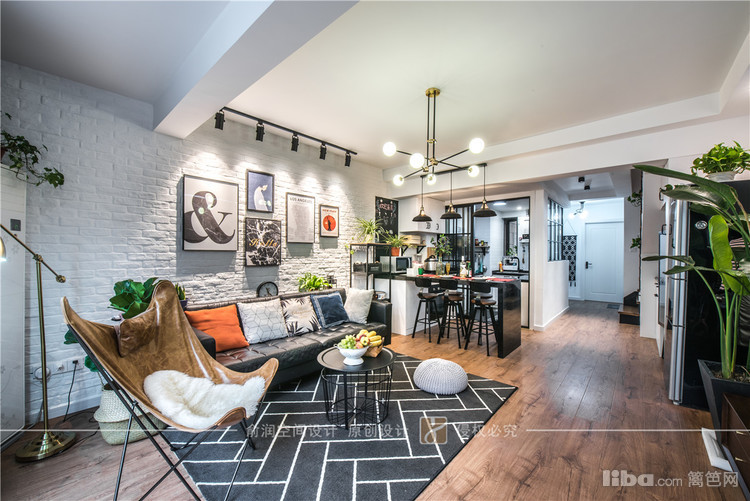 温和自然又有岁月吊顶斑驳感,开启进门的吊灯与沙发背景的轨道灯,客厅的氛围温馨小资