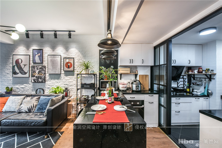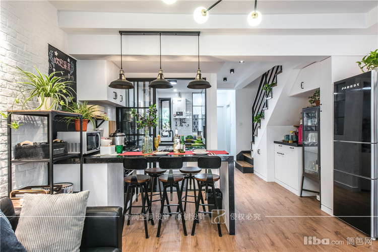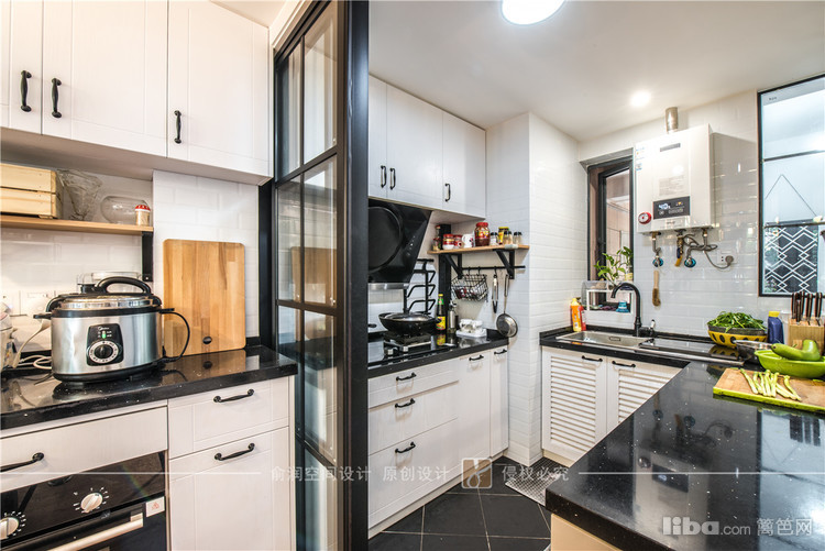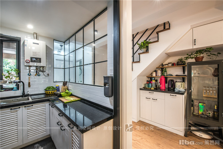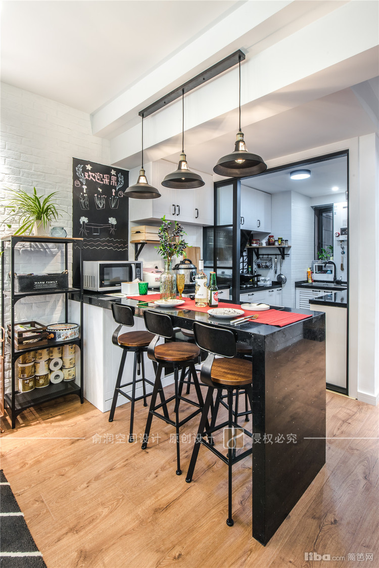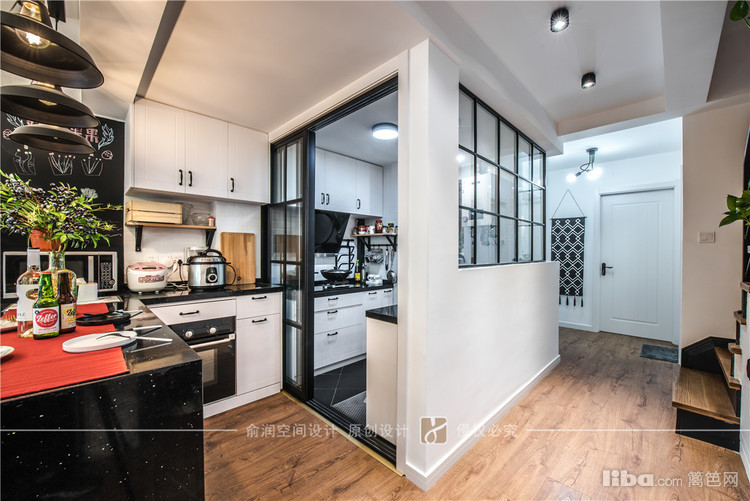 采用半墙式结构配上铁艺框架玻璃,功能区域分割,中厨的油腻区,西厨的烘培区,配上一面黑板漆,冲满了生动及富有生活。