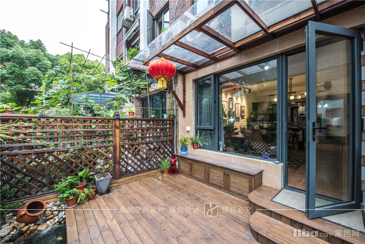 采用水泥地坪防腐木的生态做法,还特意做了个储物柜可平时坐坐户外烧烤等等。小湖水景观增加生活的情趣。