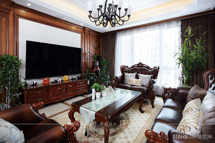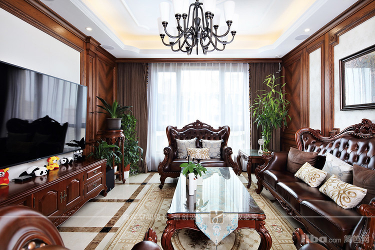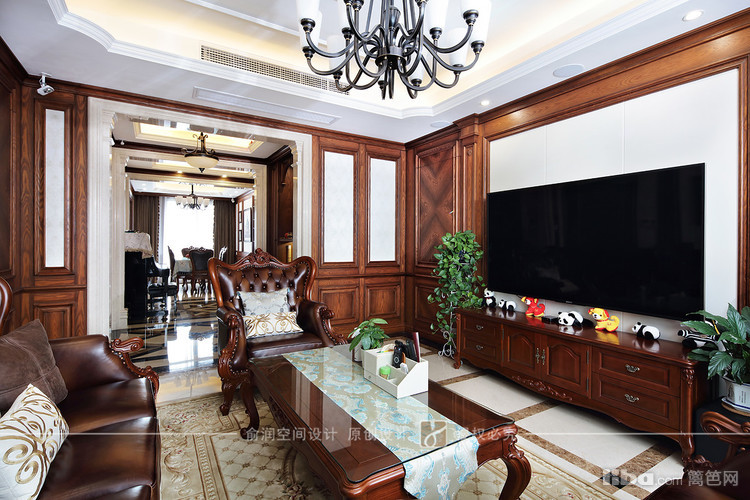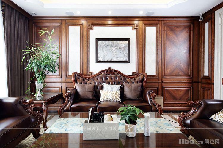皮木结合的深色实木家具,令客厅空间浑厚大气
