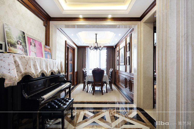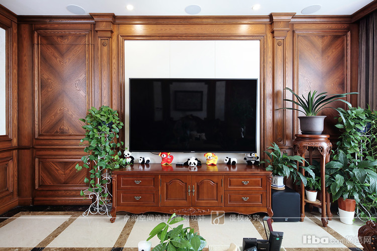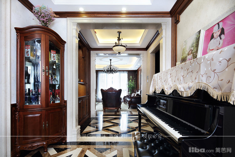 01_客厅 客厅米色大理石与深色木饰面的运用,给人以沉稳之感。精炼耐看的装饰线条,结合美式的家具饰品,空间的尺度大气又不失精致和亲切。