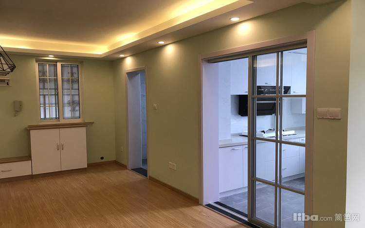 草绿色的涂料、木色系地板、吊顶分割很好的修饰了中间一根梁,解决了风水问题,而且无形中把客厅空间划分成客厅和餐厅区域