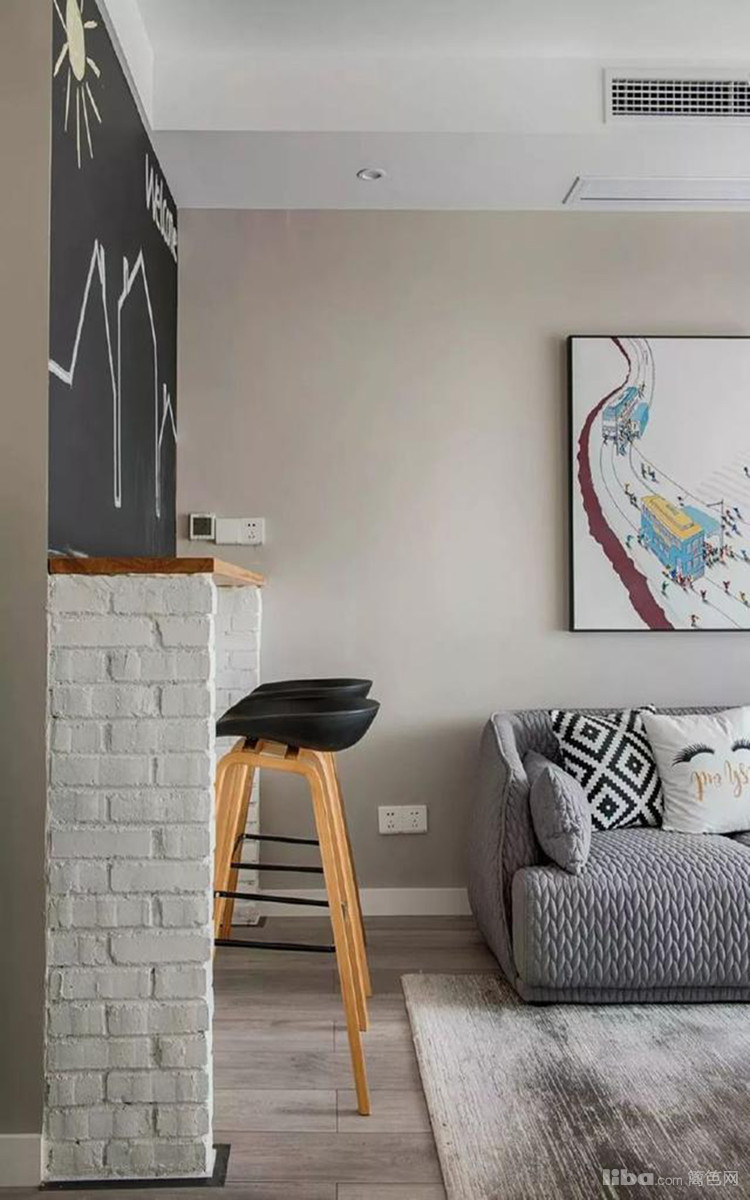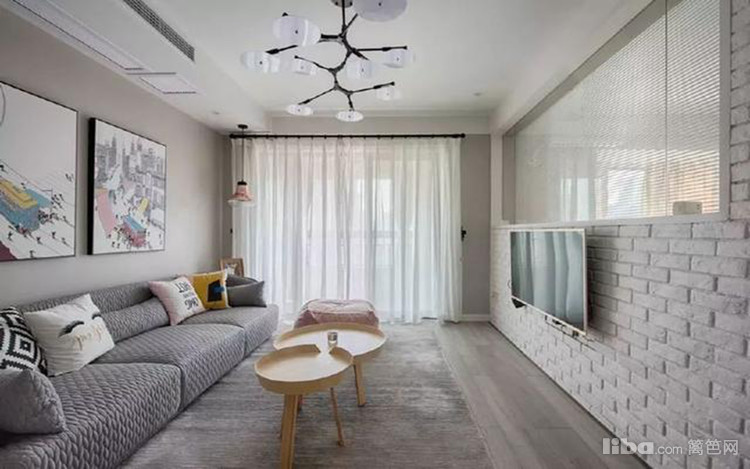客厅是家中最有北欧风的地方,文化砖背景电视墙上留出了玻璃墙,让卧室和客厅能打通起来,加上百叶帘也能保证隐私性