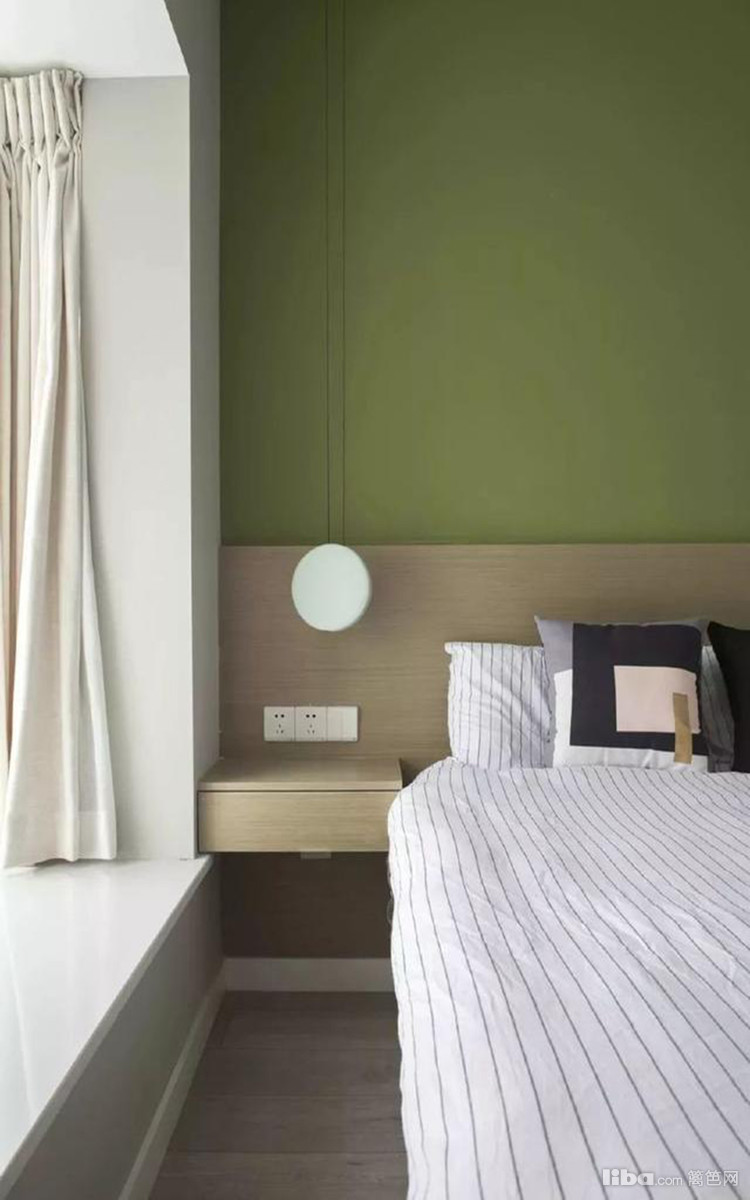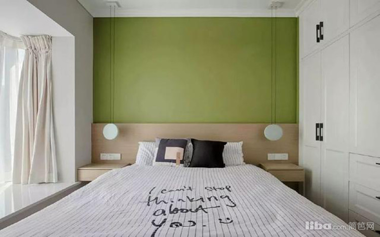 卧室以茶绿色作为背景色,对称的布局搭配嵌入式白色到顶衣柜,满足了收纳需求之余,也能让人感觉整体更加和谐