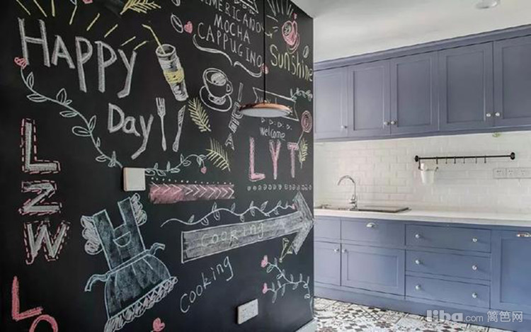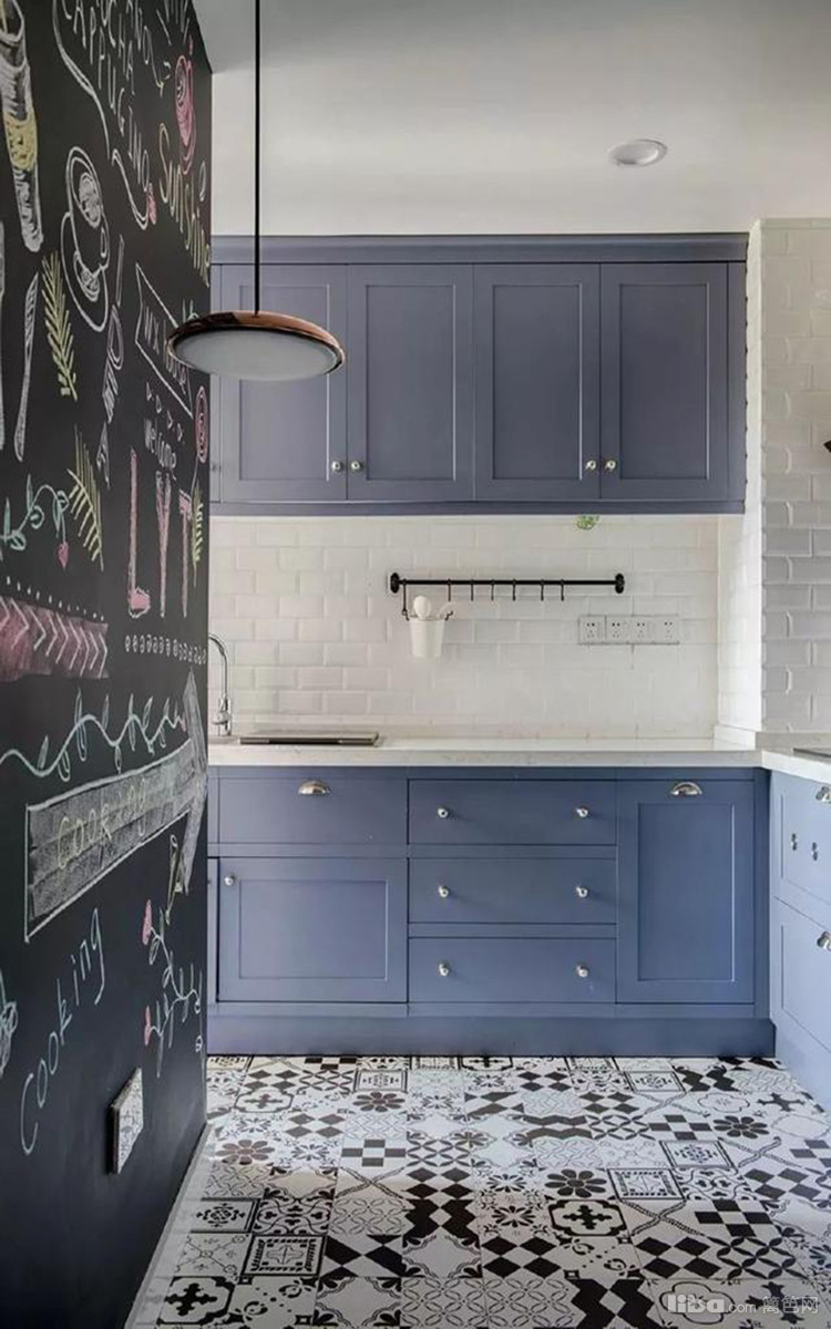 厨房通往生活阳台。厨房的整面墙被改成了黑板墙,地面的黑白花砖和墙面的小白砖,蓝色的橱柜和白色的台面,整个厨房给人一种小清新的文艺范儿感觉。