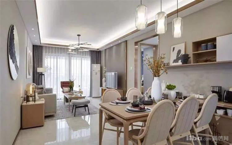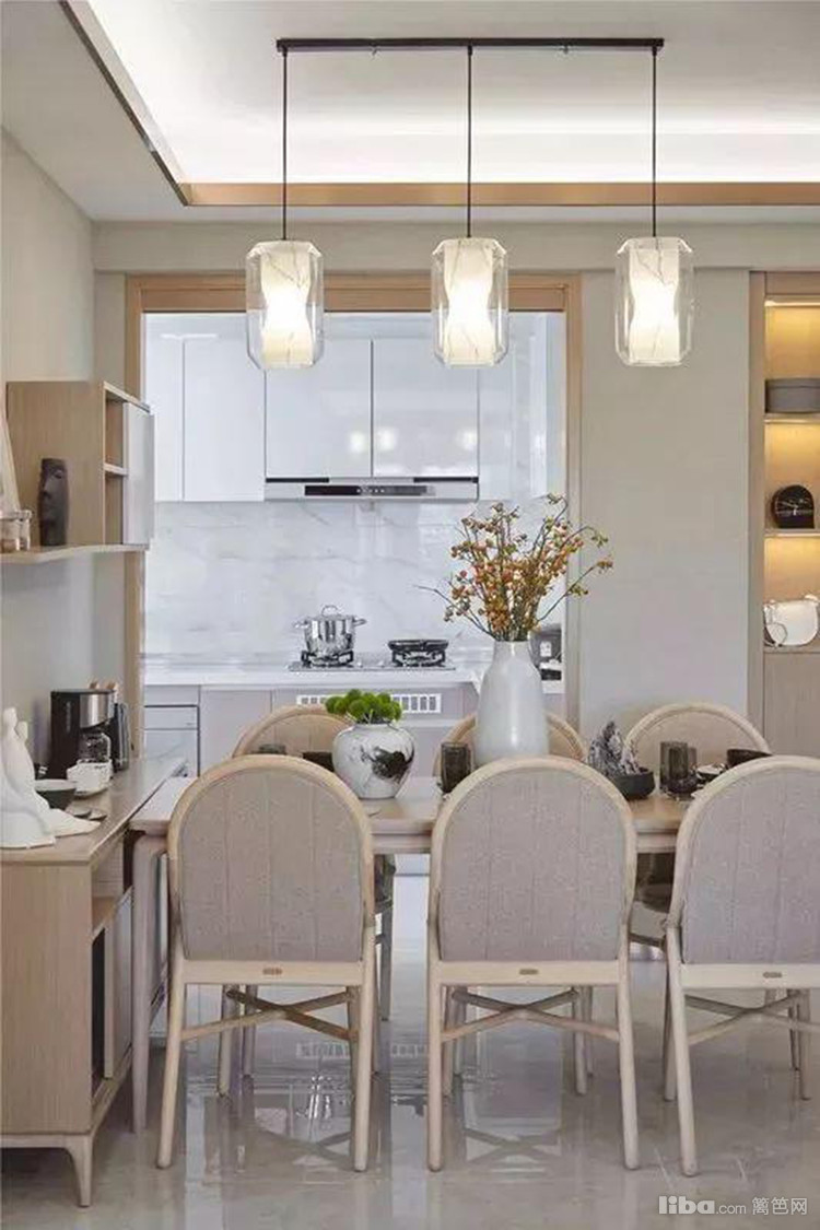 餐厅是开放式的,整体色调都是灰色系,充满高级感,一面墙做了收纳的设计,充分利用了空间,灯具的设计也非常好,和客厅形成了高低差。餐厅的后面是厨房,纯白的设计显得整洁明亮