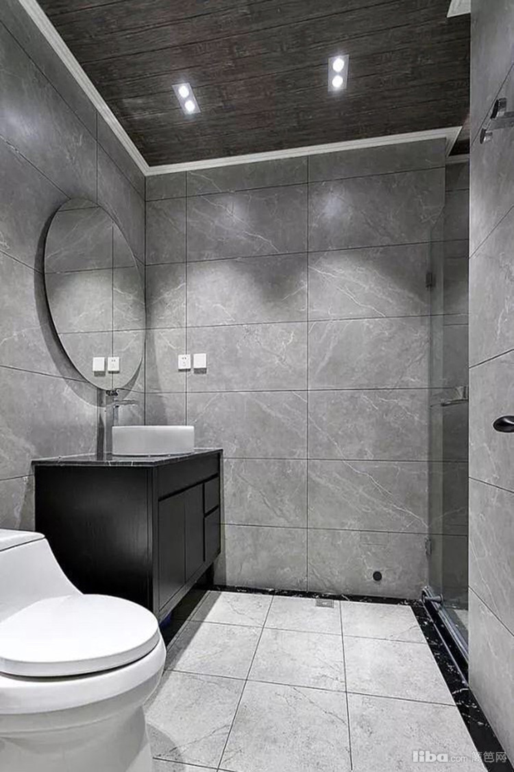 卫生间迎合了新房的装修格调,灰色瓷砖墙面,有一点工业风的感觉,黑色洗手台悬空安装,墙面上一面圆镜,足以满足日常洗漱所需