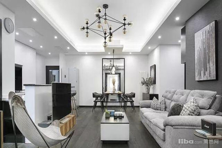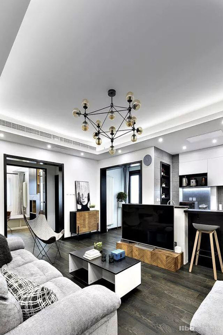 设计以开放式为主,没有直接到顶的实墙,使得室内更为通透大气,色调全屋以黑白灰为主,灰白居多,黑色点缀;电视墙与厨房区域以橱柜隔开,即是隔断同时设一个台面,方便放电视机