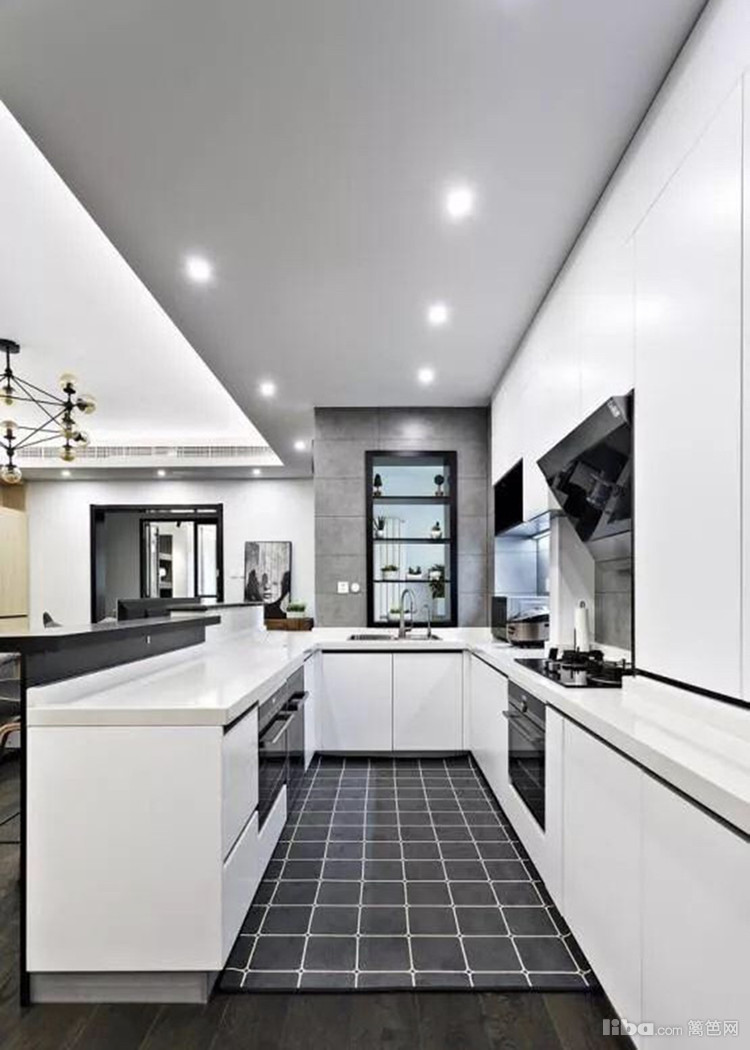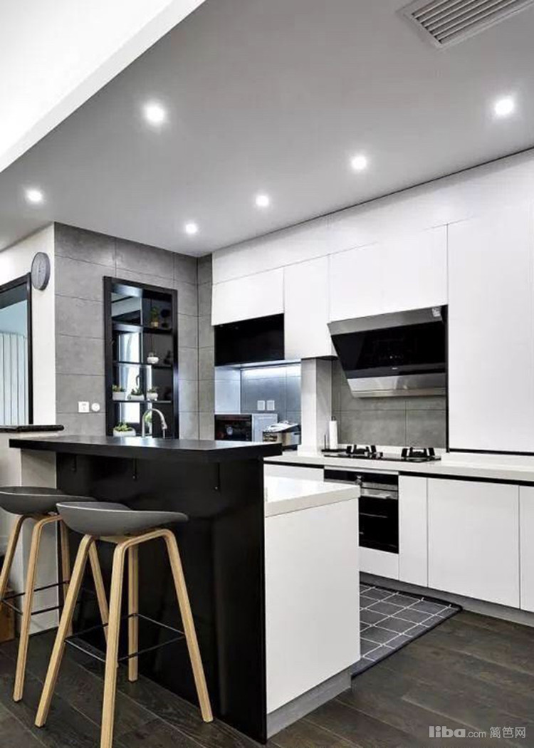 黑色吧台,放上两把台椅,瞬间多出一个休闲功能区。厨房顶面没有装吊灯,装了众多隐藏筒灯方便照明,更明亮一些。厨房U型设计,橱柜以白色为主,局部有黑色电器,与黑色吧台呼应,颜值很高