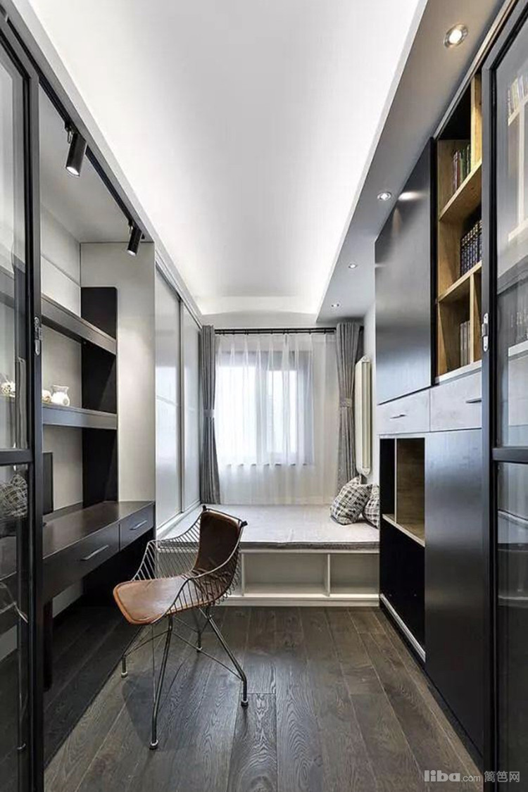 推门而进,极其实用的效果,最里面装了榻榻米,一端还连着装推拉门的收纳柜,满足日常收纳需要,榻榻米方便休息。两边靠墙分别设有书柜、书桌,以黑色为主,设计上灵活巧妙,最关键是实用