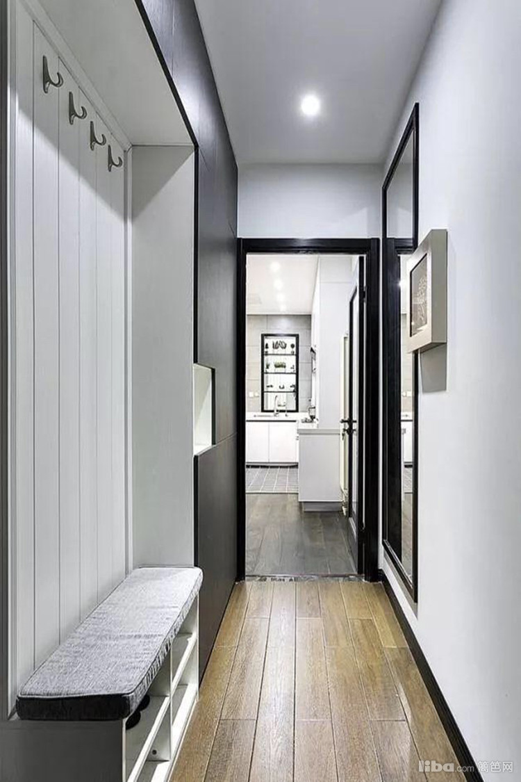 一进门处的玄关位置,设计了一款一体式的组合柜子,款式新颖又实用,换鞋凳底部是开放式鞋架,上方是挂放区,旁边紧邻黑色柜面的收纳柜,置于此处,为以后进出入收纳更方面实用些