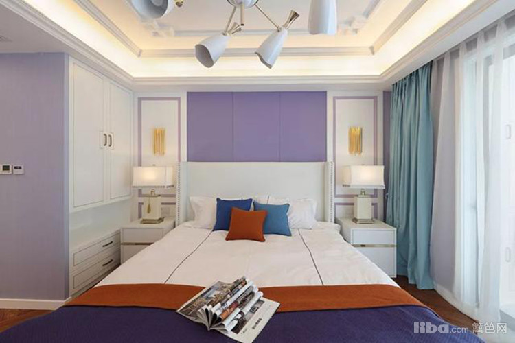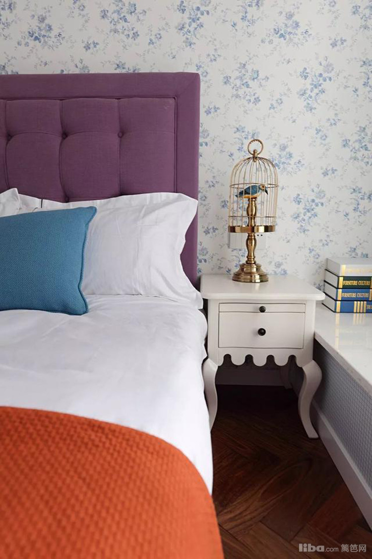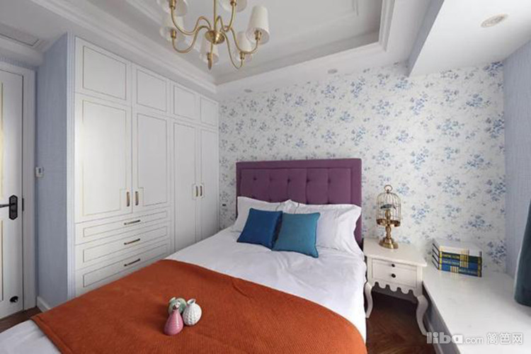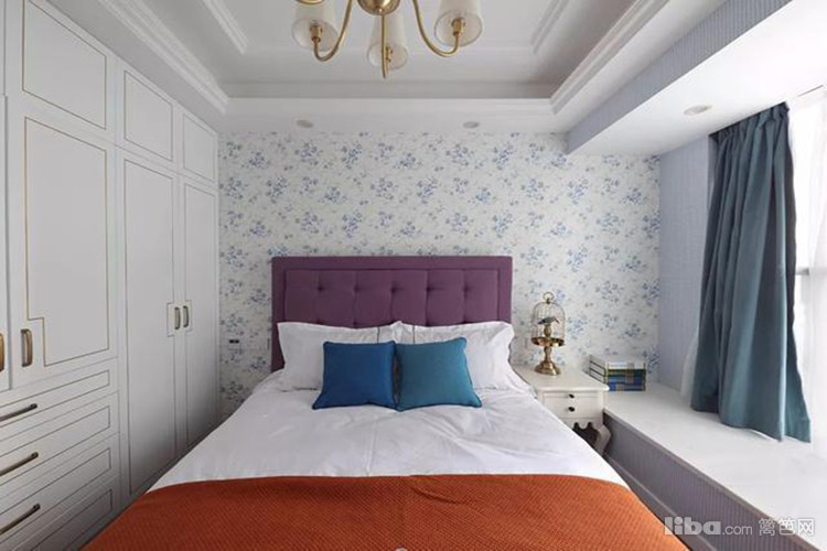 碎花床头墙,紫色床头靠背,左侧简雅的衣柜,结合悠闲的飘窗,次卧整体呈现优雅大方的舒适感