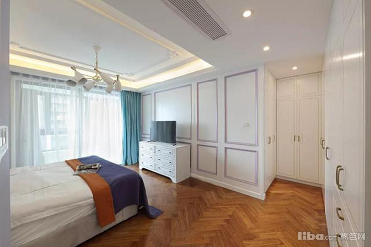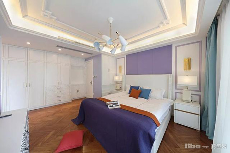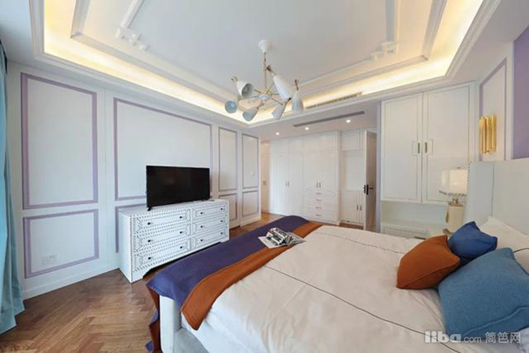 主卧跌级吊顶,人字拼的地板,床尾电视墙是简约大方的紫色石膏造型,配合满眼的白柜收纳,显得特别的自信和谐