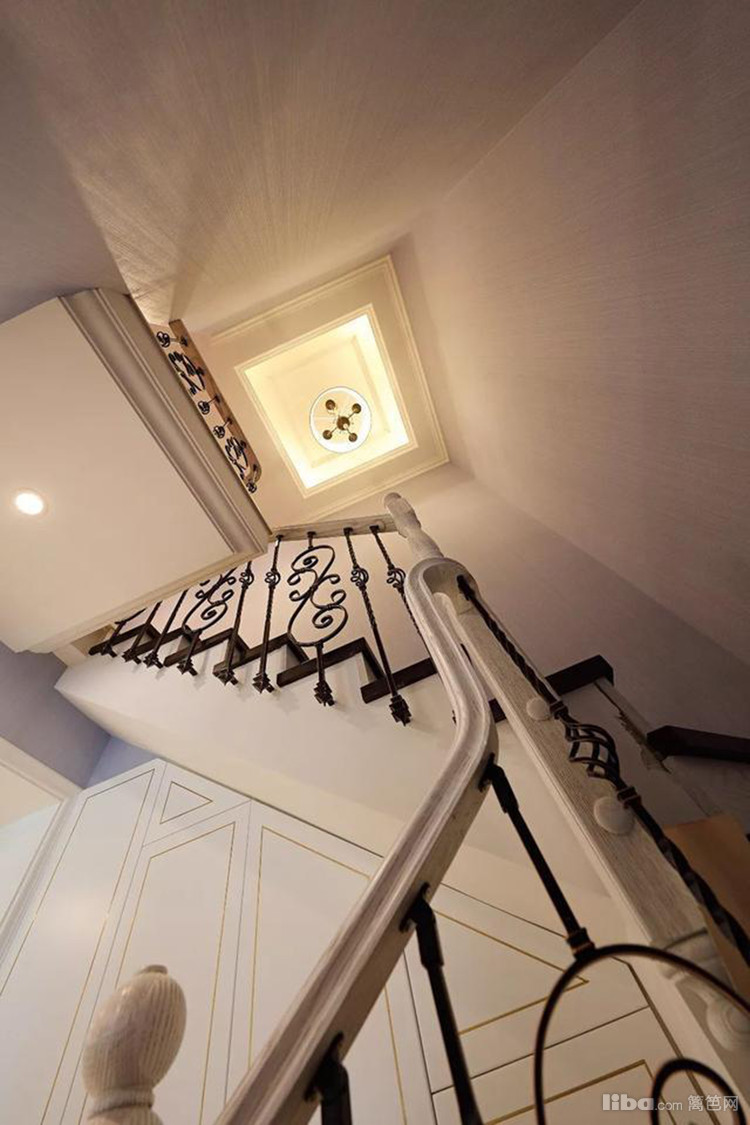楼梯上方以简单吊顶和华灯的配合,营造了高档矜贵的气息