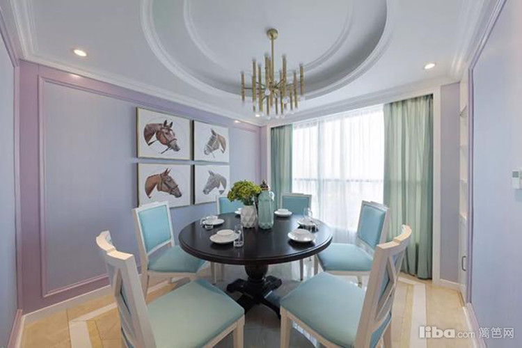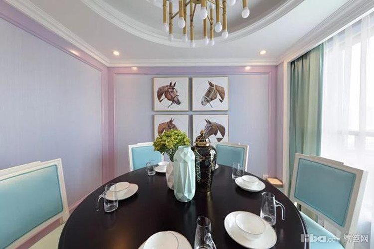 圆形的天花吊顶,整体紫粉色的墙面,深木色餐桌搭配粉蓝色的餐桌椅,整体营造了轻松惬意的就餐氛围。