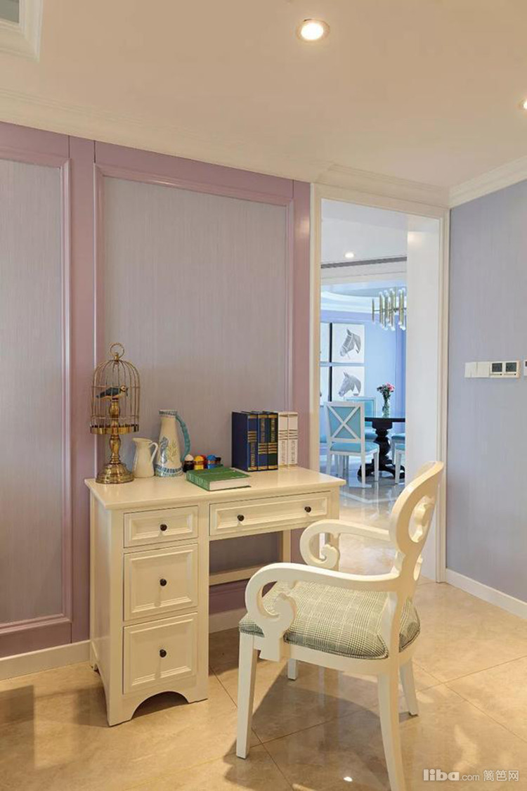 边几旁拜访了一套象牙白的书桌,摆上书籍、饰件和铜制鸟笼,打造了一个高档优雅的办公空间