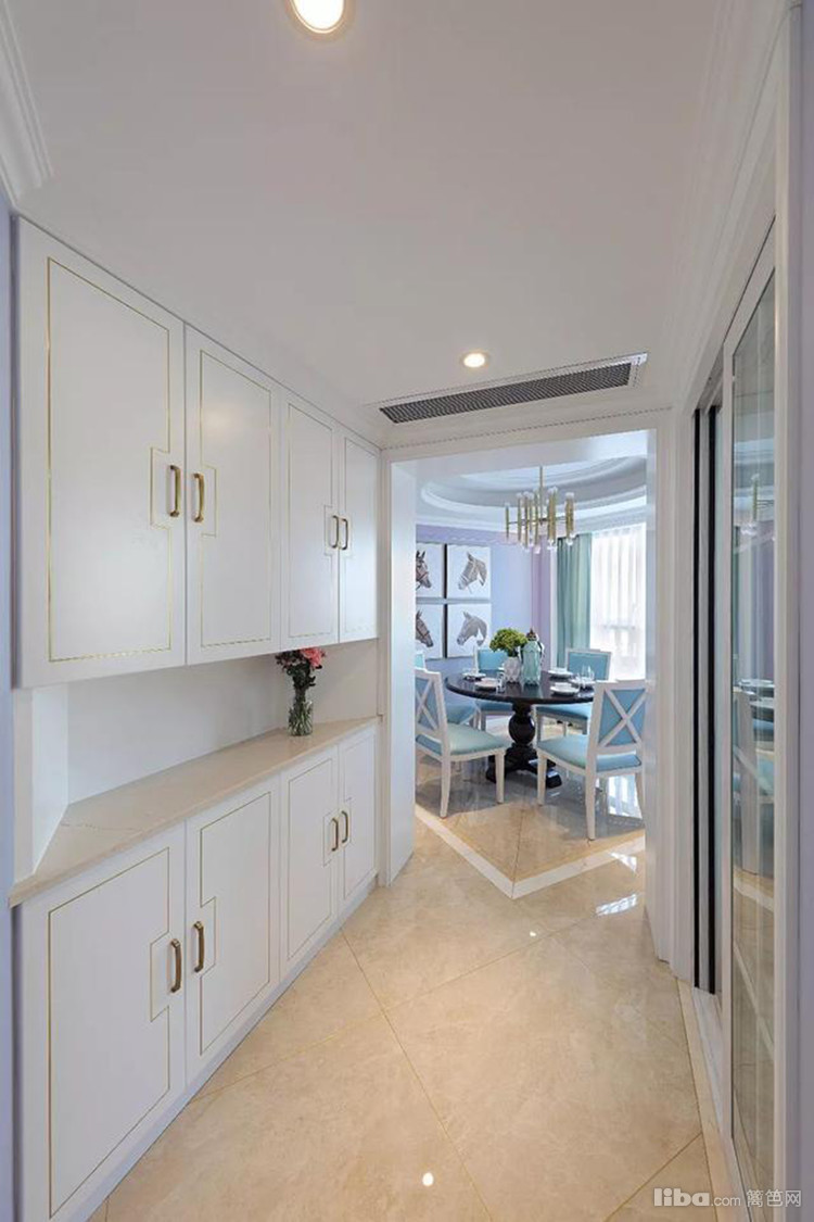 左侧过道摆了个新古典风格的端景台,配合地面白色边线,显得典雅端庄