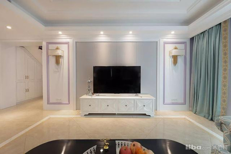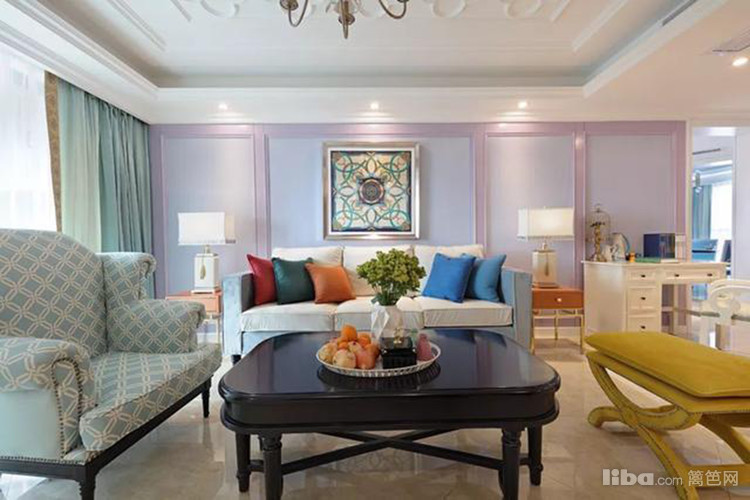 客厅整体是对称的布局,粉紫色沙发墙加石膏造型,搭配一幅典雅的装饰画,大方端庄又自由浪漫。电视墙做了硬包处理