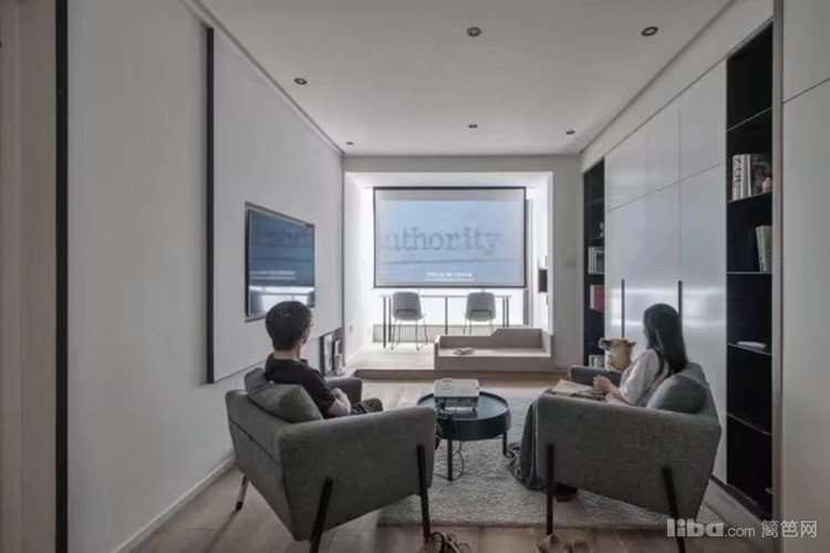 工作区和阳台连接处装了电动幕布,沙发选择了轻便的款式,轻松打造舒适的家庭影院