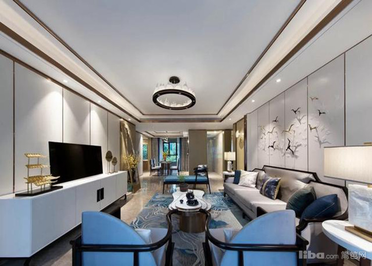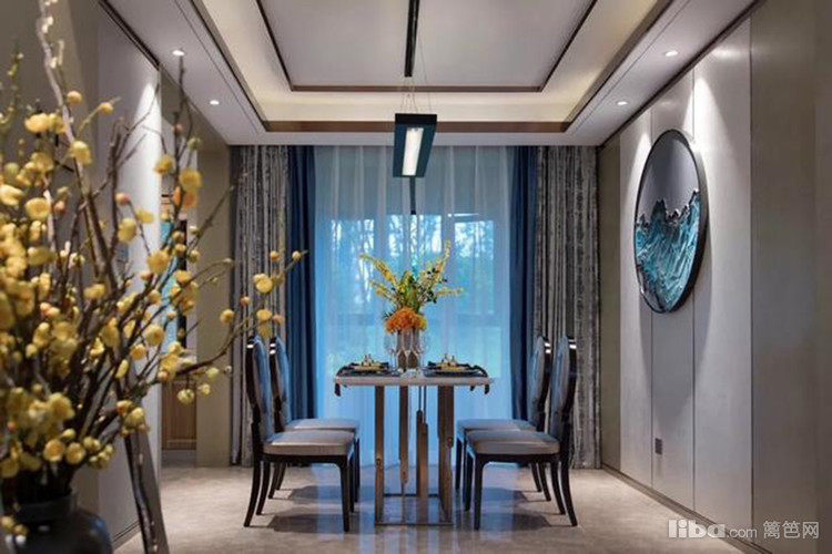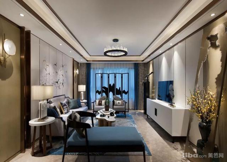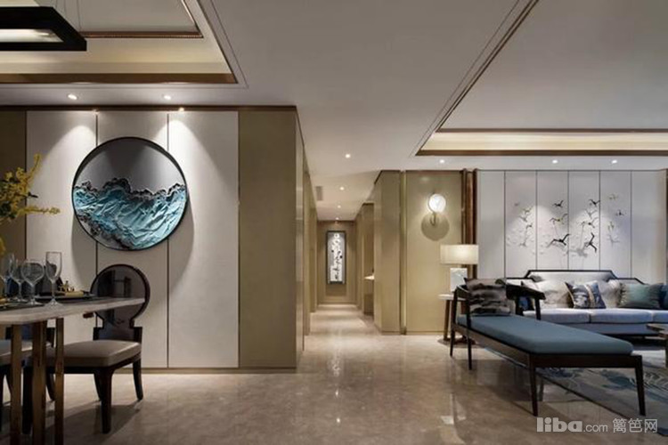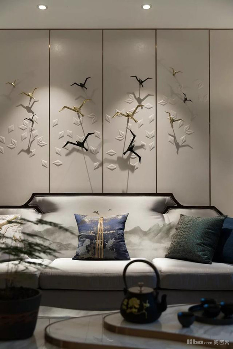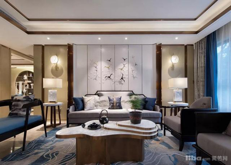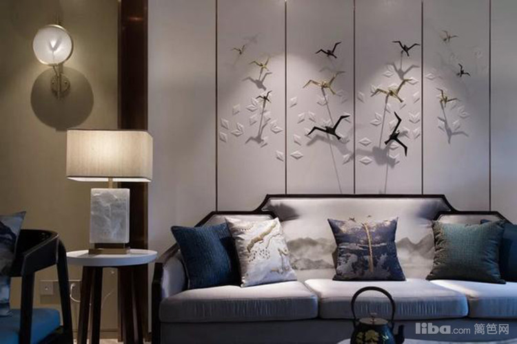 这套房子的设计理念是山水如画,层峦叠嶂。沙发背景墙运用了山水飞图案,已经满满。客厅家具线条流畅,造型别致的茶几,仿屏风造型的背景墙,边桌上四四方方的桌灯也透着中式的传统美学