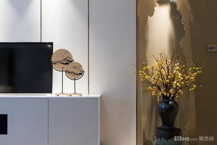 电视机旁的软装也在极力烘托着中式氛围,两色花束提亮空间