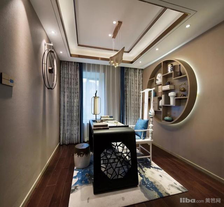 书房被夸爆。两侧的圆形装饰非常美。圆形实木置物架,取日出日落之意蕴