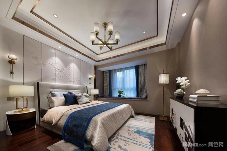 主卧依旧是仿屏风背景墙,灰白为主,装饰由海军蓝和水墨相结合,自然韵律,无以复加
