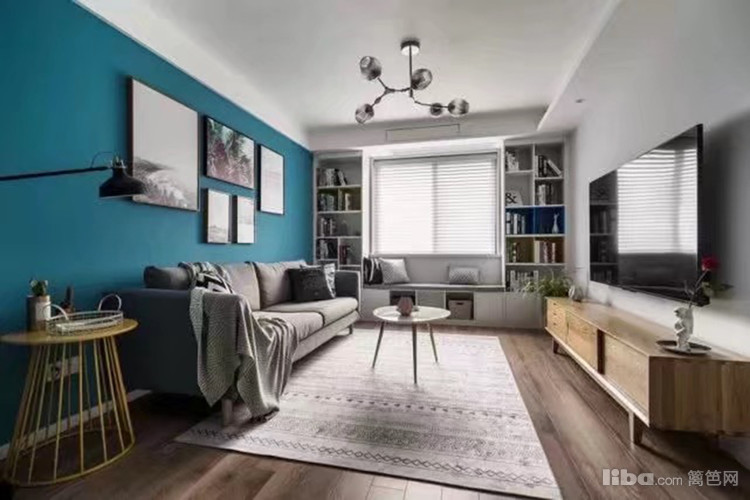 整个客厅空间给人一种简洁大方的感觉,孔雀蓝的背景墙上点缀几幅挂画,沙发、茶几、边几和电视柜都是简单利落的造型