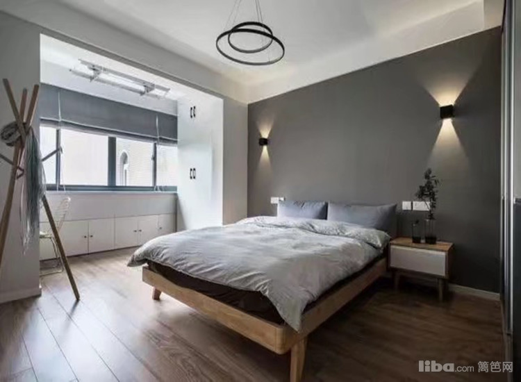 主卧室的床头背景墙刷了深灰色,左右两侧对称的壁灯和顶部的创意吊灯,带来格调满满的感觉