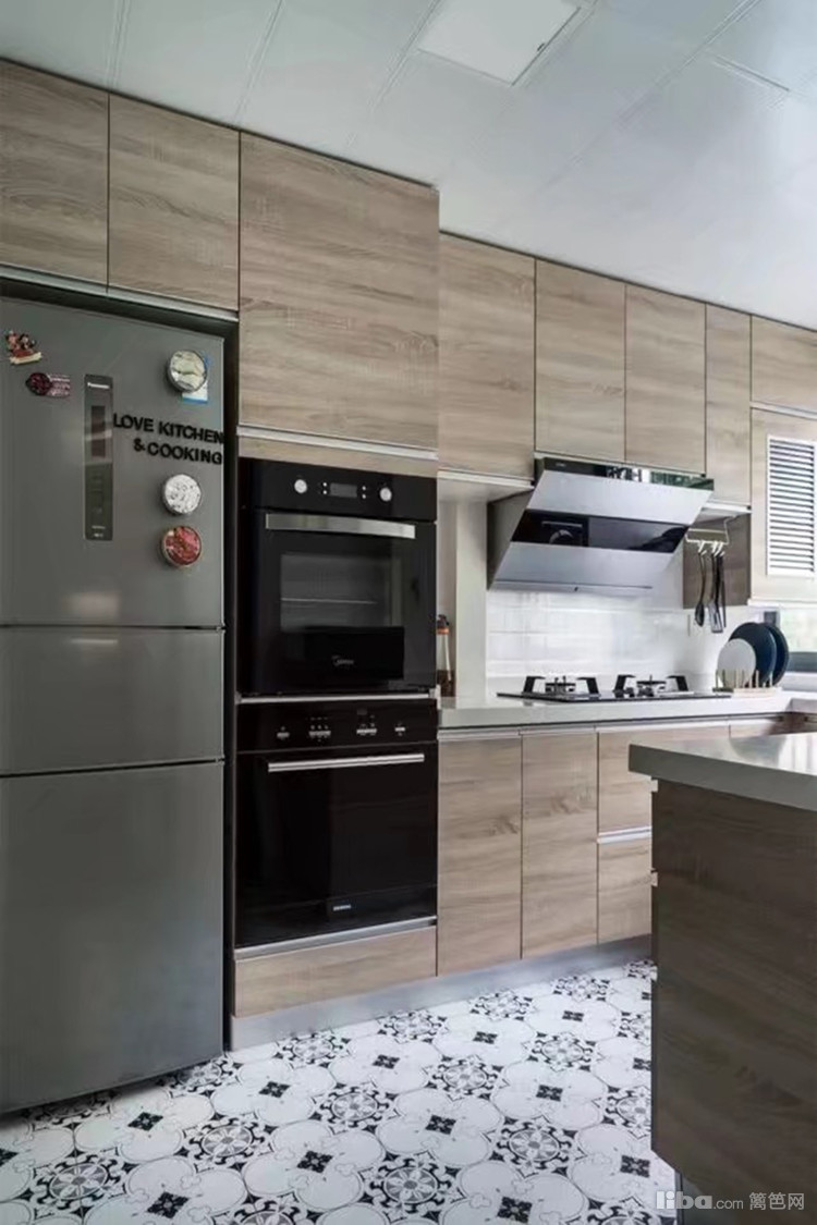 木质的橱柜为主色,地面铺设创意花砖,墙面是小白砖,冰箱和一些厨房电器都被嵌入了橱柜当中,更加有整体感