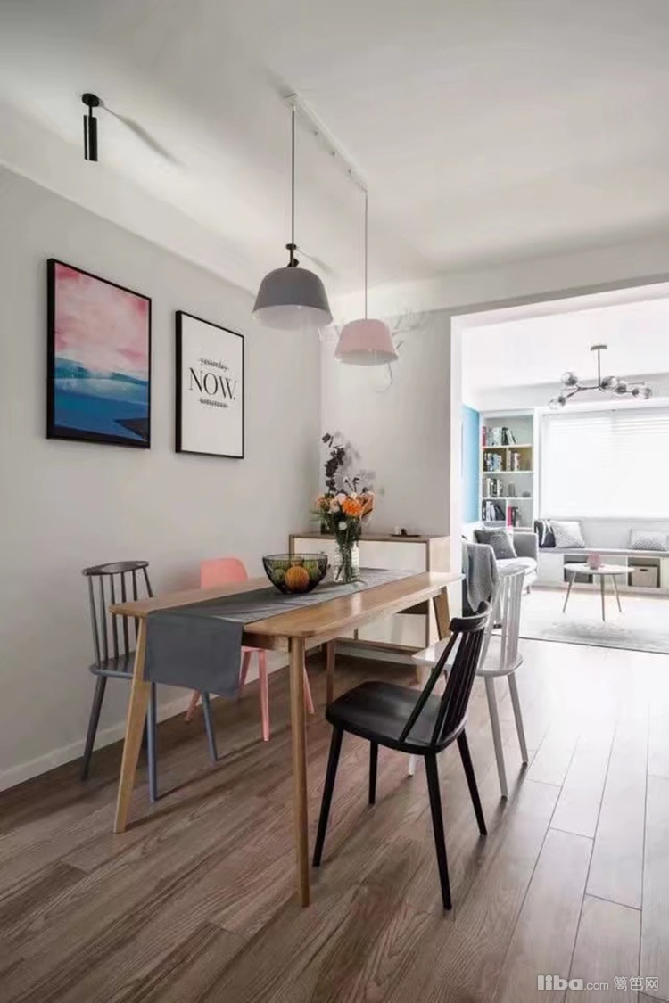 入户即餐厅的户型,灰色和粉色的餐桌椅与吊灯互相呼应,木质的餐桌、原木与白的斗柜,点缀用的绿植和干花,都给餐厅注入了轻松、自然的感觉