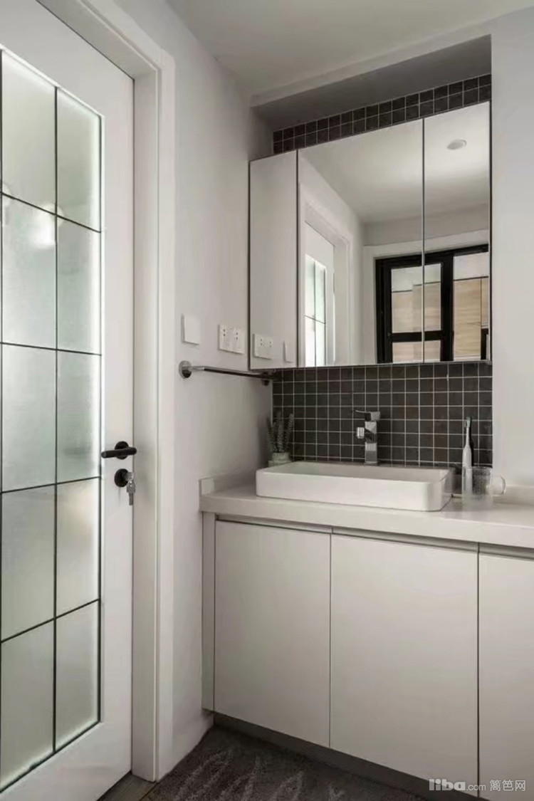 卫生间干区墙面贴了黑色方格砖,搭配白色的浴室柜,黑白的对比更显得干净整洁,一扇磨砂玻璃门,丰富了采光又保证了足够的私密性