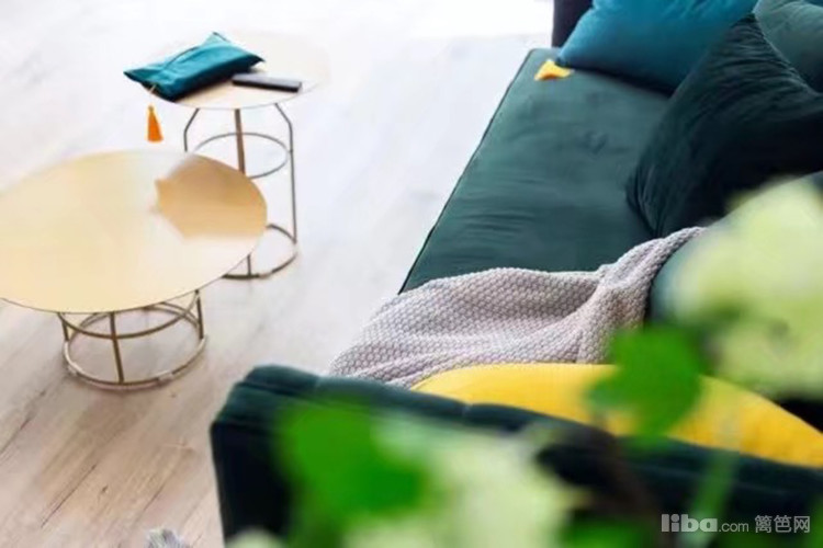 客厅通铺木地板,不做任何复杂吊顶造型,简单吊灯,深绿色丝绒沙发搭配金属圆几,同样深绿色电视柜呼应搭配,整体简洁,又有个性范