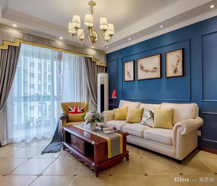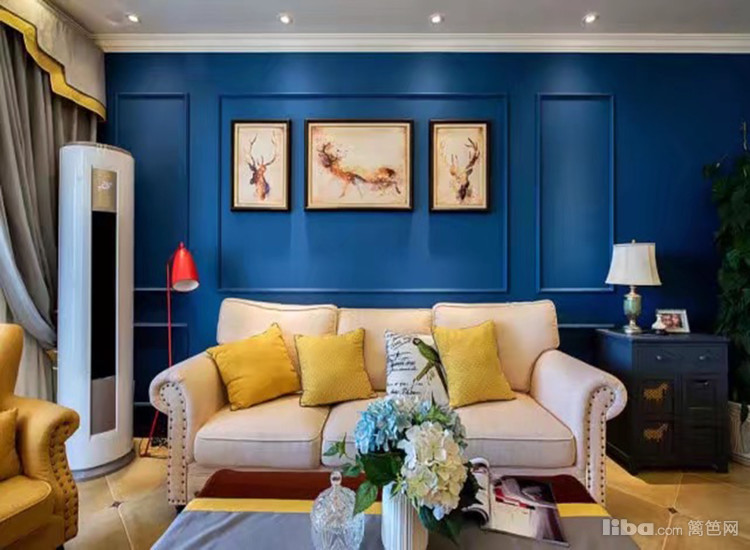 纯净的蓝色墙面与奶咖色布艺沙发相配,表现出明朗、清爽与洁净