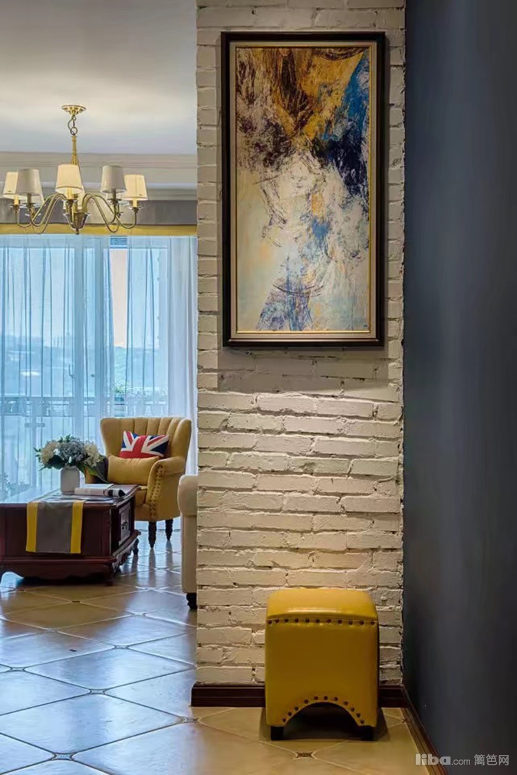 不想客厅一览无余,用白色文化砖、抽象画来装点玄关,空间并不大的小户型玄关,以收纳为主,上下层空间巧置的鞋柜正好能够用来归纳日常物品、鞋